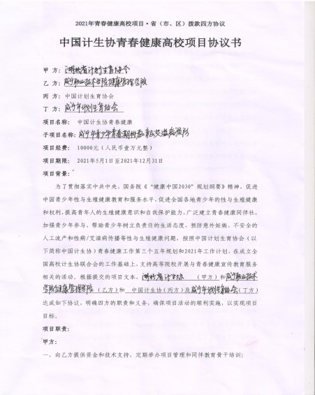 2021年5月与中国计划生育协会、湖北省计划生育协会、咸宁市计划生育协会共同签署2021年青春健康高校项目,全面贯彻落实中共中央、国务院《健康中国2030规划纲要》精神,促进我校青少年性与生殖健康教育和服务水平,提...
