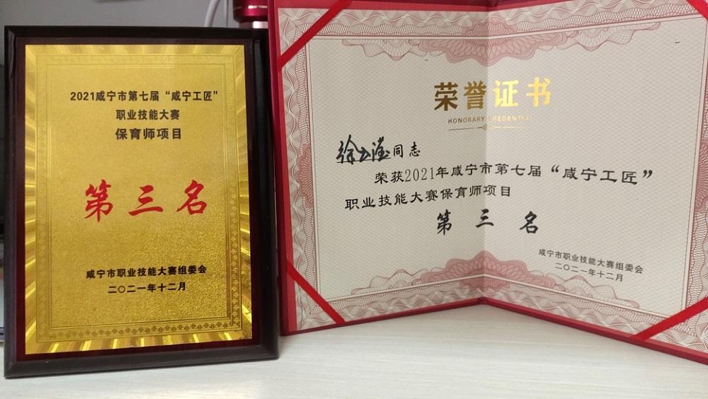 经过两天的精彩角逐,有着深厚技能功底的徐玉滢靠着自己的耐心和毅力,敢于挑战、超越自我,取得本届职业技能大赛保育师第三名,荣获“咸宁工匠”称号!