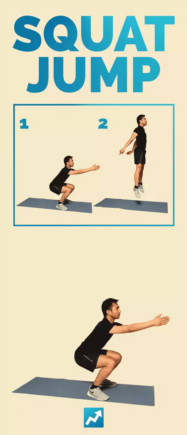 说明:深蹲至大腿与地面保持平行,挺胸,扬手,用手臂的力量带着身体跃起,尽量高跳,跃出时吐气。舒缓下落。