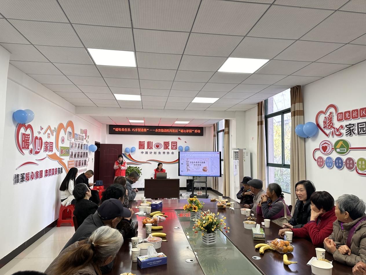 为践行志愿服务精神,传递对计生特殊家庭的关怀,11月26日,咸宁职业技术学院健康管理学院桑榆之春志愿服务队走进永安街道阳光社区“暖心家园”,以青春力量助力“暖冬养生乐·巧手聚温情”主题活动,用实际行动书写校社联动的温情篇章。