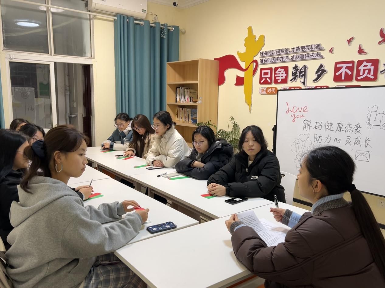 为帮助大学生树立健康恋爱观、提升亲密关系经营能力。2025年12月19日,健康管理学院于24栋学生公寓“琢玉坊”举办了主题为“解码健康恋爱,助力心灵成长”的心理团体辅导活动。本次活动由辅导员安影老师主持,10名学生共同参与,展开了一场关于爱与自我成长的深度对话。